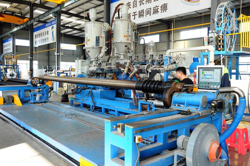 1、缠绕:熔融状态的HDPE平料带及包覆PP的圆形加强筋同步缠绕在加热到预定温度的钢模上
